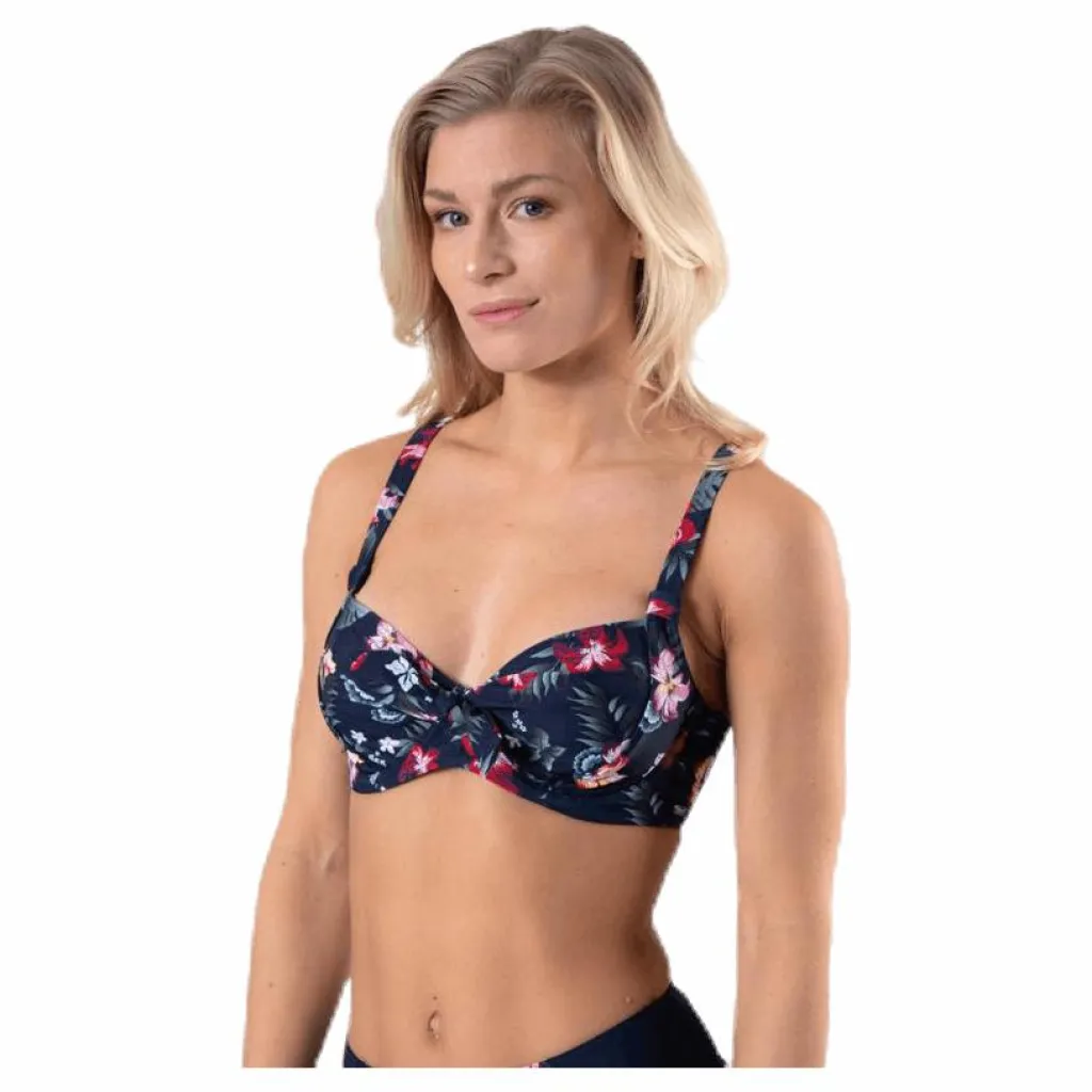 Blommig bikiniöverdel med bygel på fin navy botten. Ofyllda kupor men med support i sidorna för extra bra stöd. En snygg och enkel bikini-BH som verkligen sitter som en vanlig BH.