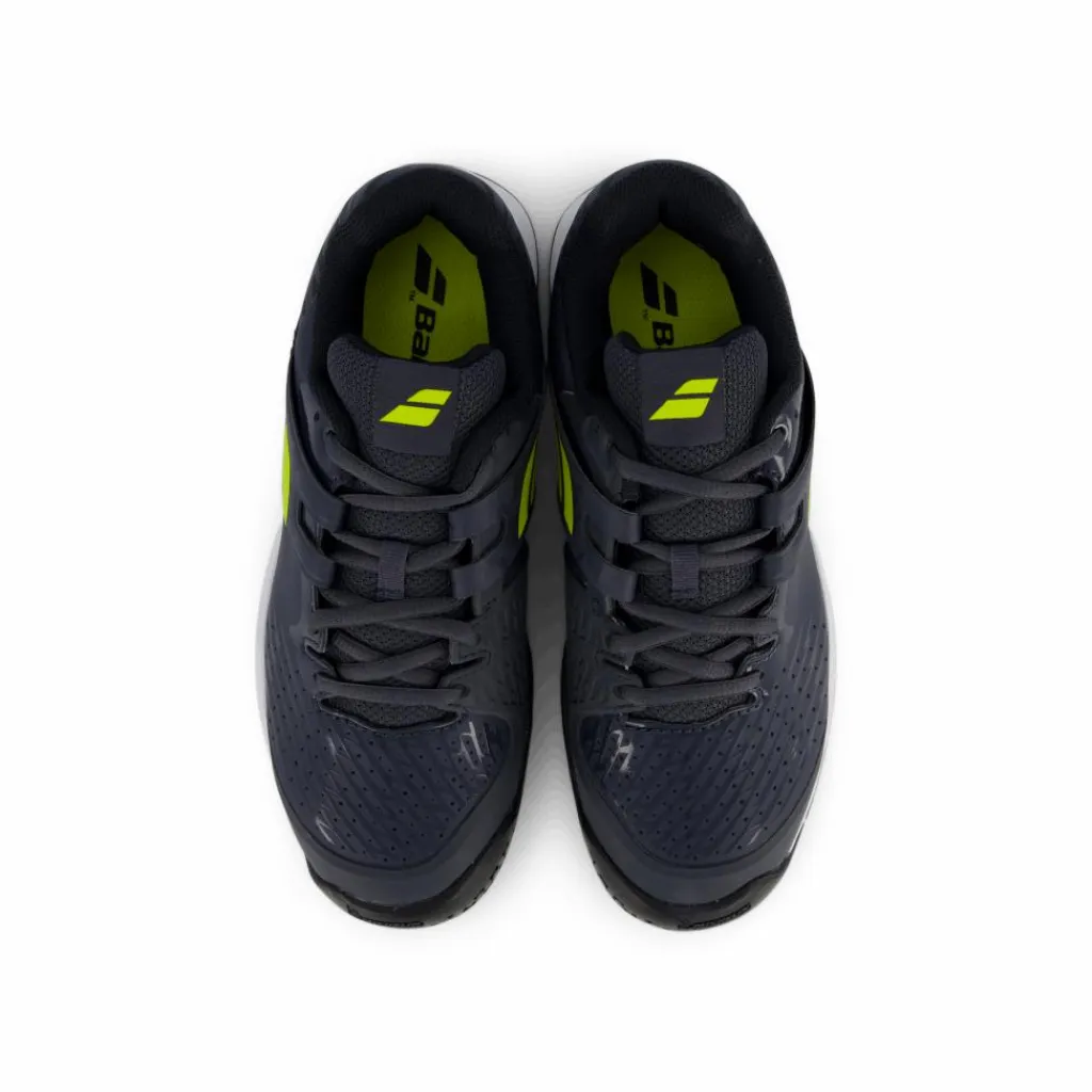 Unga tennisspelare kan spela sitt bästa med stil med Babolat Propulse Ac Jr i en kombination av grå och aerofärger. Dessa juniortennisskor erbjuder både komfort och stöd, vilket säkerställer att barn kan röra sig tryggt och se bra ut på banan.