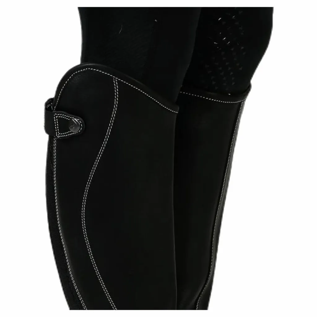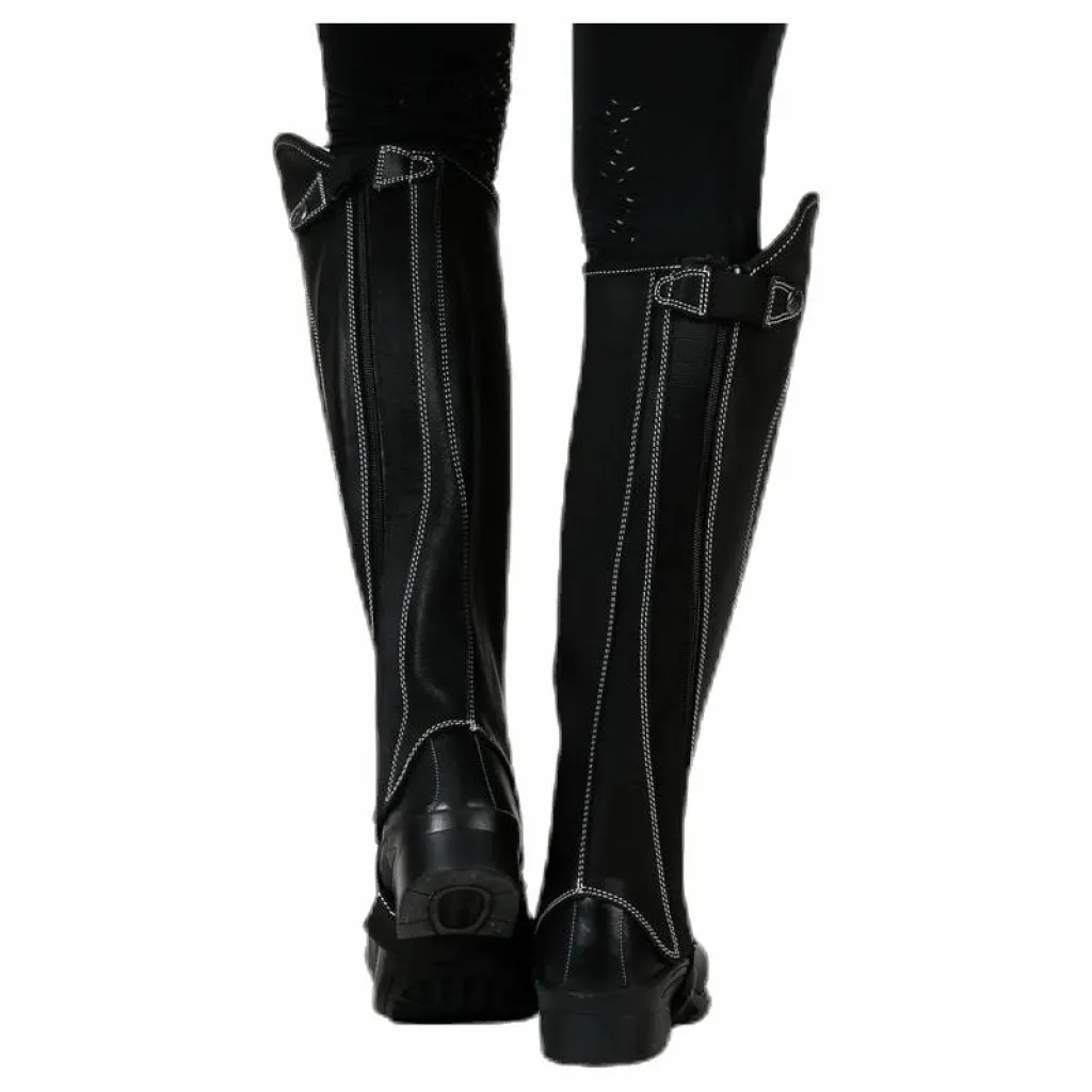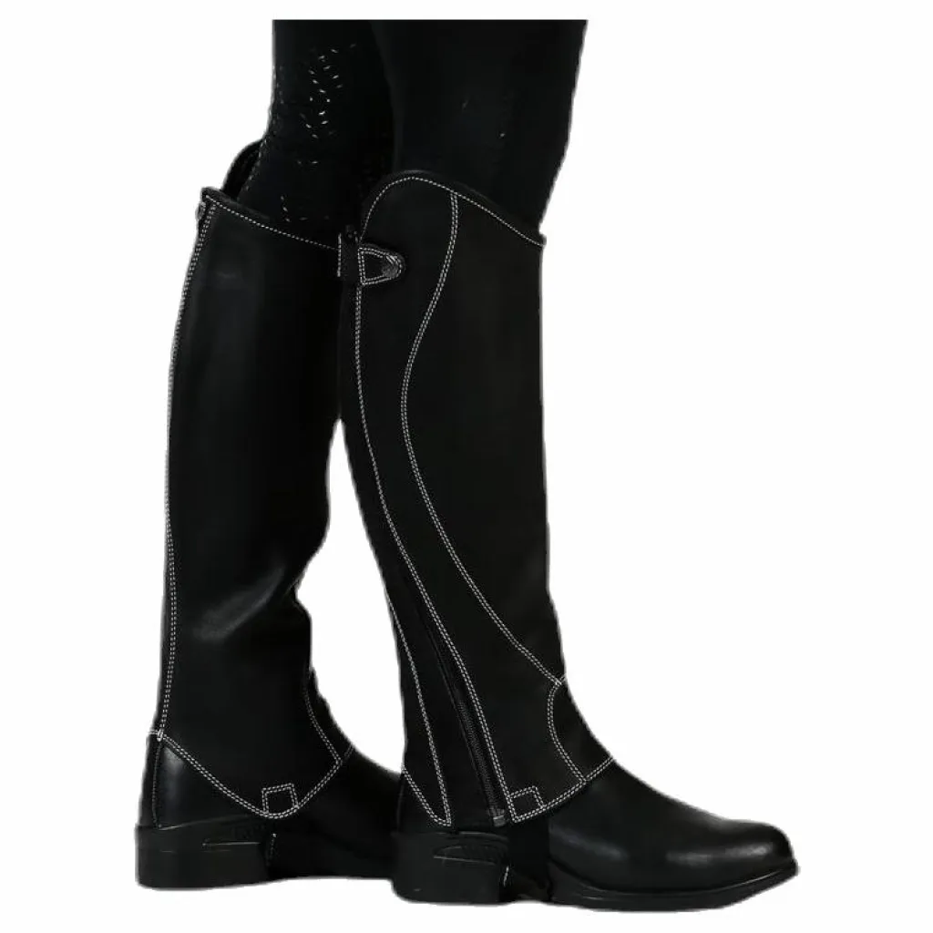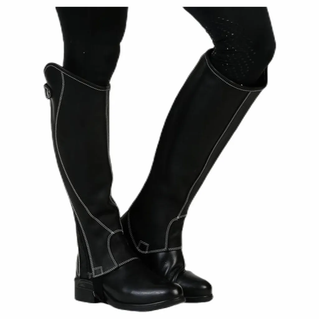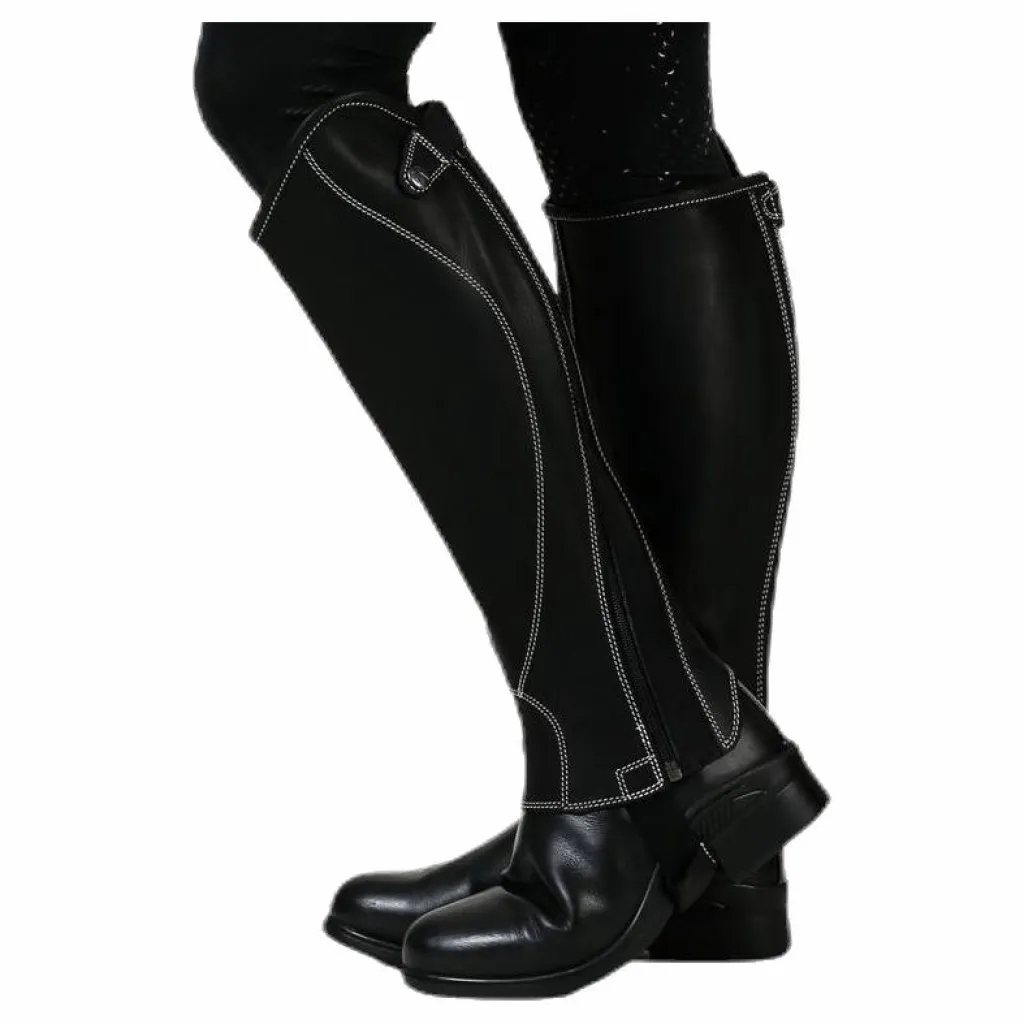 Shortchaps i mjukt och smidigt läder med vita dekorsömmar. Resår längs dragkedjan för optimal passform. Storlekarna S, M, L finns även i vid.