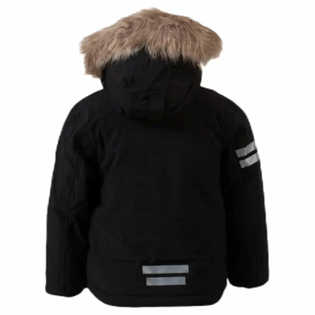 Äventyr Väntar! Vinterstoppad och vattentät jacka med bra egenskaper. Funkar lika bra på skolgården och fökolan som i skidbacken. Tillverkad i polyester/softshell; ett mycket mjukt och följsamt material med stretch. Jackan är fodrad med fleece i ryggen och nylon i övrigt. ärmsluten går att justera med kardborre. Jackan är funktionell och utrustad med snölås i midjan, dragsko längst ner, tejpade sömmar och reflexer på ärm och rygg. Huvan är justerbar och avtagbar med päls i syntet. På jackan finns också två sidofickor och två bröstfickor. Vattentät 15.000 mm och andas 6.000 g/m2/24h. Flourkarbonfri ytbehandling.