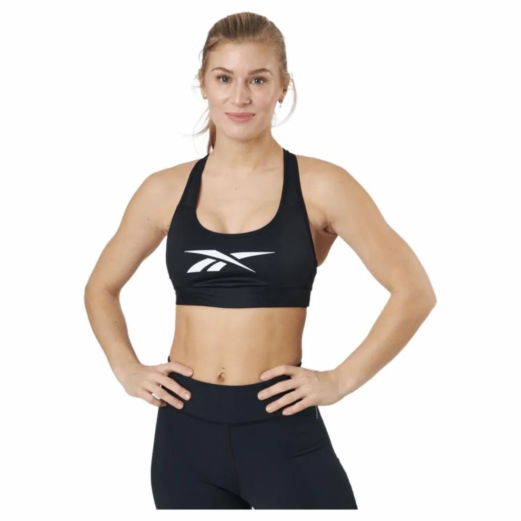 En snygg racerback-sport-bh är ett måste för vardagsträning. Denna Reebok-bh är gjord av andningsbart material med Speedwick-teknik för att hålla dig torr och bekväm i alla takter. Den erbjuder medium stöd för dansklasser, gympass eller spinn. Avtagbara kuddar ger valfri täckning.