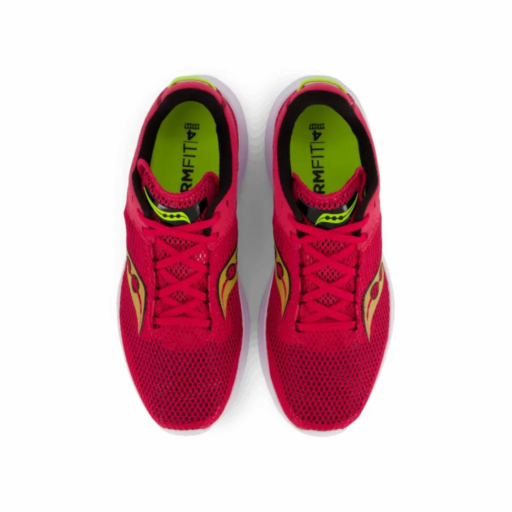 Årets version uppdateras med en 3 mm högre stack height vilket levererar en mjukare stötdämpning än tidigare. Den nya ovandelen är smidigare och lättare än någonsin, allt för att bibehålla den härliga fartkänslan som gjort Kinvara modellen till en legend. Mellansulan består av Sauconys unika PWRRUN Foam och toppsulan av Saucony topmaterial PWRRUN+ för bästa komfort. Ett häl till tå-dropp på 4 mm dropp ger löparen möjlighet till ett effektivt och kraftfullt frånskjut. Den unika FORMFIT-passformen skapar en optimal och individuellt omslutande passform runtom hela foten. Toppen av mellansulan är anatomiskt fotformad för att vagga in foten och ge bättre stöd kring häl och hålfot. Ovanifrån kramas foten om på ett bekvämt och stabilt sätt med hjälp av en formbar, sömlös och väl ventilerande mesh. Ovandelen består dessutom av återvunnet material, för att reducera vårt ekologiska fotavtryck. Yttersulan i EVA och slitstarkt XT900-gummi är optimerad för låg vikt, snabb fart och bra grepp.