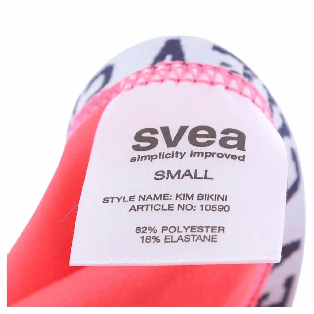 Kim bikini har ett stort sveaprint mitt fram på bikiniöverdelen. Toppen har axelband som är av elastiska resårband och korsas bak i ryggen. På axelbandet, toppens nederkant och på trosan är loggan som sträcker sig hela vägen runt om.
