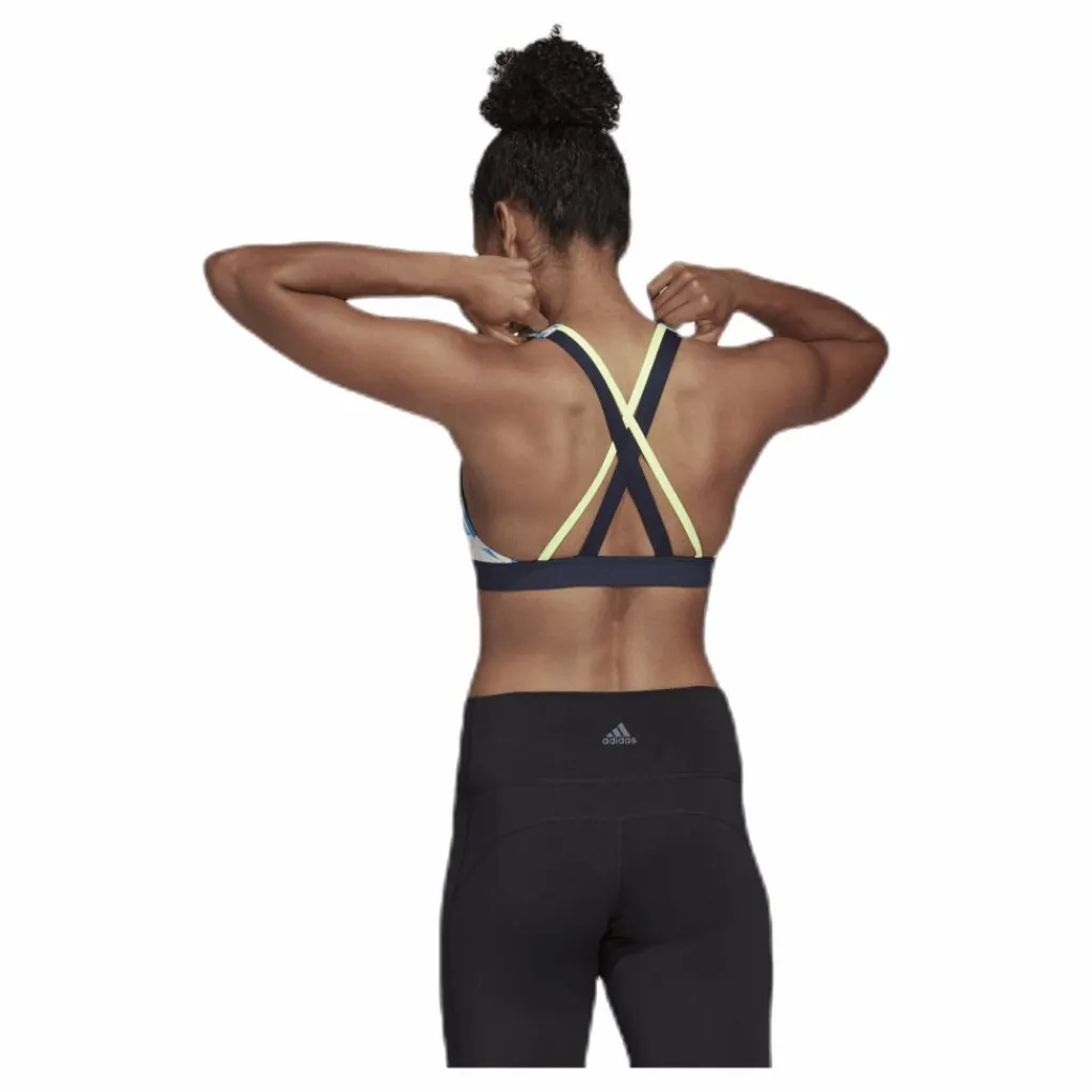 Denna sport-bh med medelstöd är utformad för medelintensiva träningspass såsom cykling, cirkelträning och snabba promenader. Den är framtagen med en kompressions-passform för ett erbjuda dig en fixerad känsla. Det mjuka, lätta tyget stöter bort fukt från din hud. Sport-bh:n ingår i en kollektion som tagits fram med inspiration av Stella McCartney och är därför helt täckt i ett iögonfallande mönster. Rund hals. X-rygg. Foder i mesh. Interlock i 79% återvunnen polyester / 21% elastan.