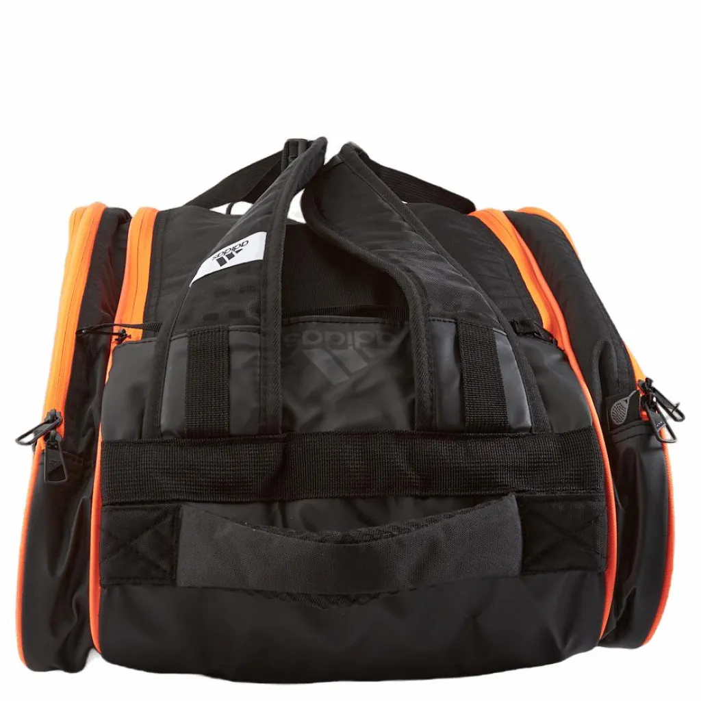 Den här väskan är gjord av slitstarka material och är byggd för att hålla och tål slitage vid regelbunden användning. Det svarta och orangea färgschemat är både snyggt och iögonfallande, vilket gör det enkelt att hitta din väska i ett hav av andra tennisprylar.