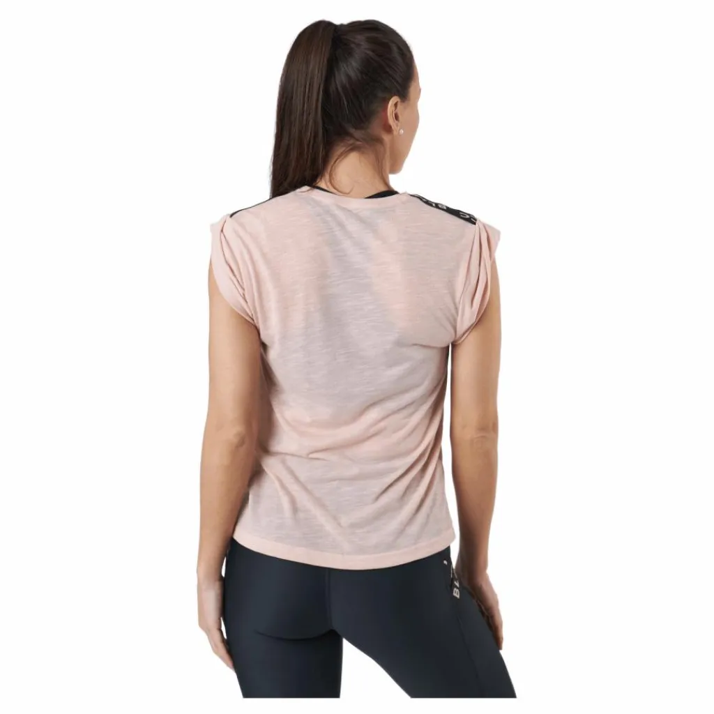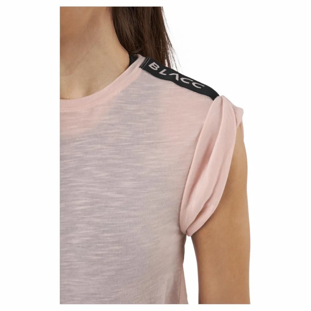 Denna Power X Muscle Tank i polyester är en tränings-t-shirt för kvinnor som är designad med rund hals och korta ärmar. Skjortan bär varumärket BLACC i svart och vitt med en illustration av en kvinna i rosa som håller vikter.