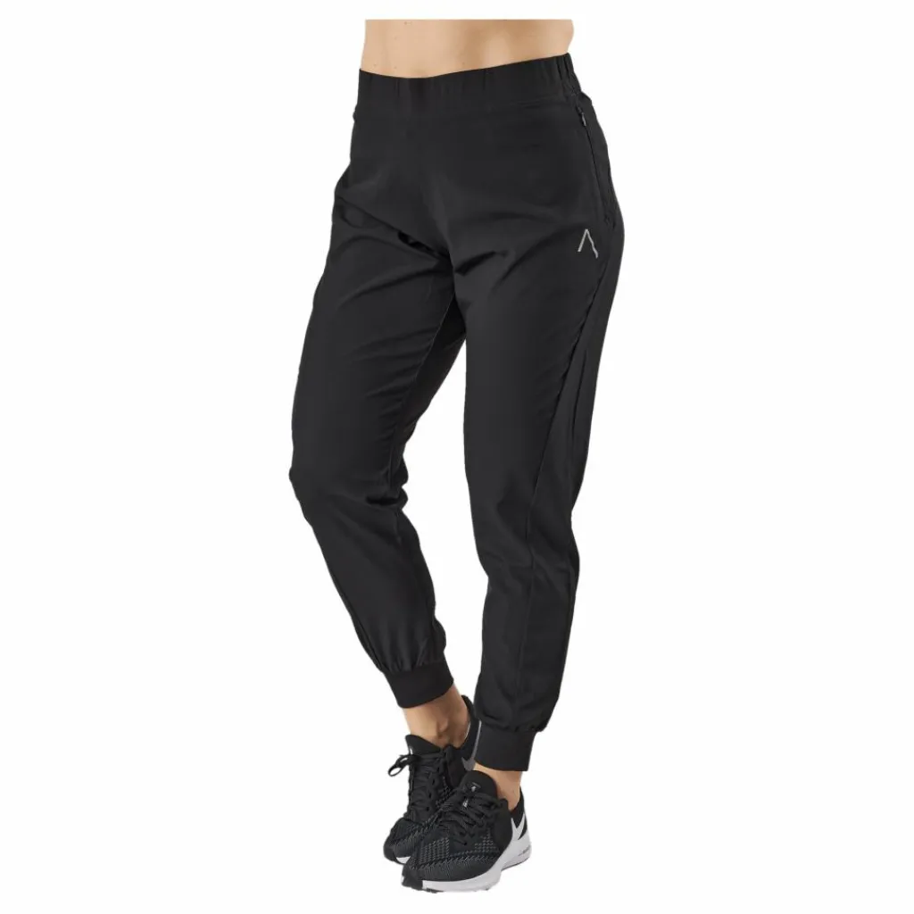4-vägs stretchvävda löparbyxor med sidofickor med dragkedja, ok bak, dragsko på insidan och reflekterande silvertryck