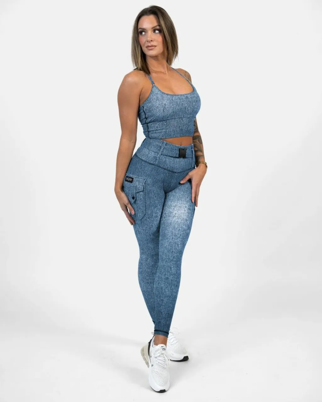 Vi presenterar våra snygga cargo-tights med perfekt passform och ett trendigt denimmönster. Dessa tights är idealiska för både gymmet och vardagskläderna, och har en moderiktig denimfärg och ett mjukt, lyxigt tyg. Designade för att framhäva dina kurvor, de erbjuder en överlägsen passform. Tillverkade av förstklassigt stretchmaterial, ger de ultimat rörelsefrihet och exceptionellt kroppsstöd under dina träningspass. Praktiska lårfickor ger bekvämlighet, vilket gör dessa tights till den perfekta blandningen av stil och funktionalitet.