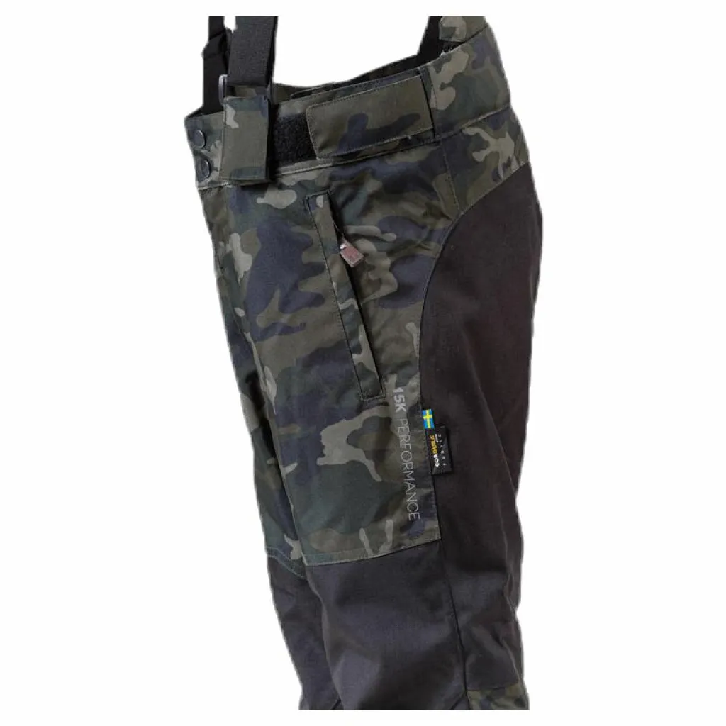 Redo för vintern! Sköna, vinterstoppade täckbyxor med fleecefoder på rumpan och nylonfoder på benen. Passar lika bra på skolgården och förskolan som i skidbacken. Det finns möjlighet att dra åt runt midjan med hjälp av kardborre och hängslerna är justerbar och avtagbar. Byxan har snölås, reflexer längst ner på båda ben och justerbara benslut med kardborre så man lätt kan öppna upp. Tillverkad i Polyester/softshell med stretch; ett mycket mjukt och följsamt material. Tejpade sömmar, vattentät 15.000 mm och andas 6.000 g/m2/24h. Flourkarbonfri ytbehandling.