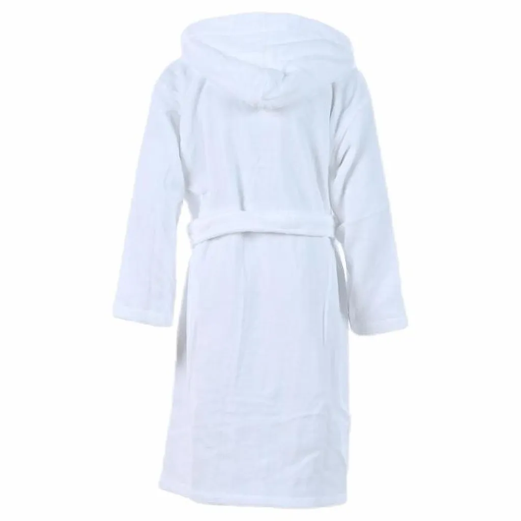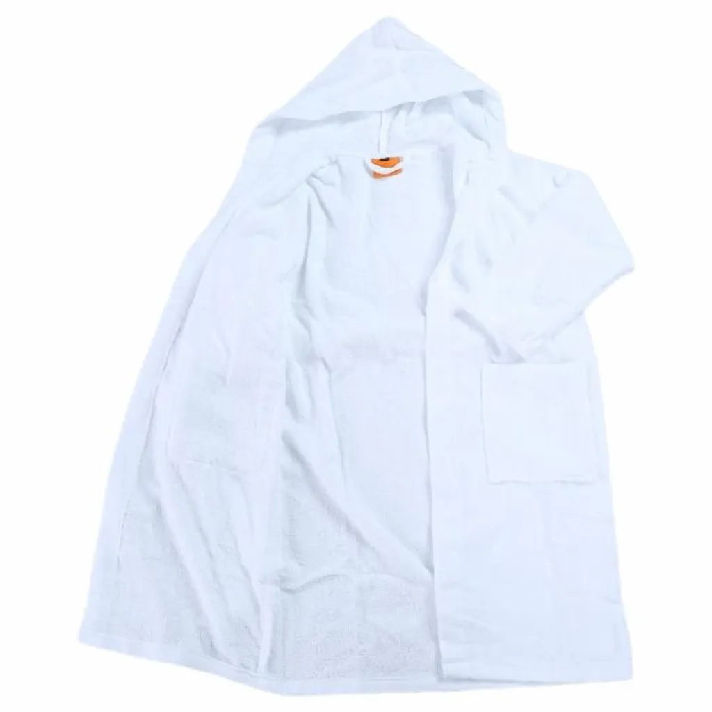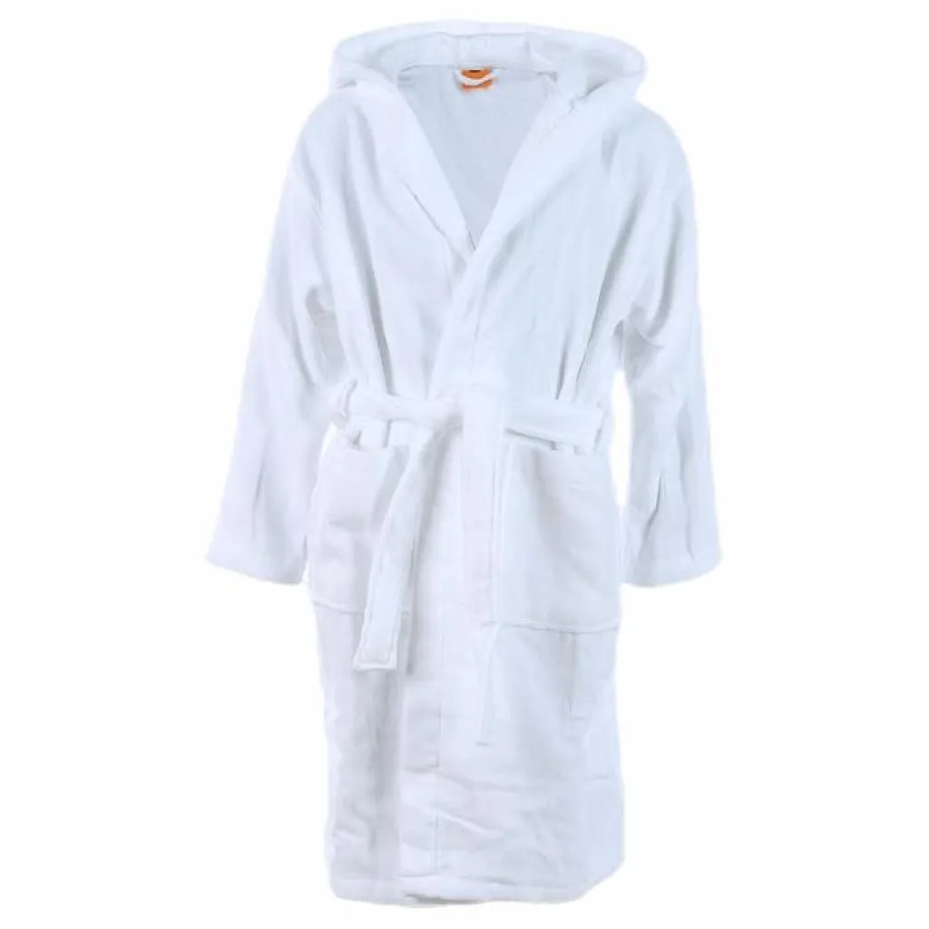 Badrock med huva och fickor på sidorna tillverkad i bomull som är mjuk och har en god absorberingsförmåga. Knytband i midjan. 100% bomull.