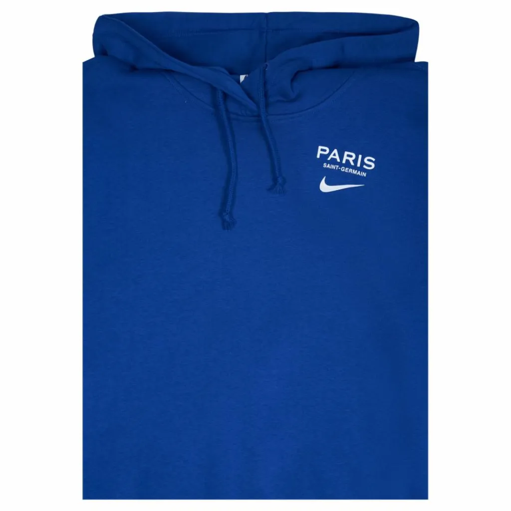 Paris Saint-Germain huvtröja i fleece för dam Täck dig mysigt med Paris Saint-Germain-huvtröjan. Dess ryggborstad fleece med en överdriven passform ger dig en ultramjuk och superavslappnad känsla. PSG-detaljer fram och bak visar din kärlek till ditt lag – oavsett om du kommer eller går. Slät på utsidan och mysig på insidan, borstad fleece är vårt bästa sweatshirtmaterial för kallare temperaturer. Ribbstickade ärmslut och fåll hjälper till att hålla hoodien på plats medan du rör dig.