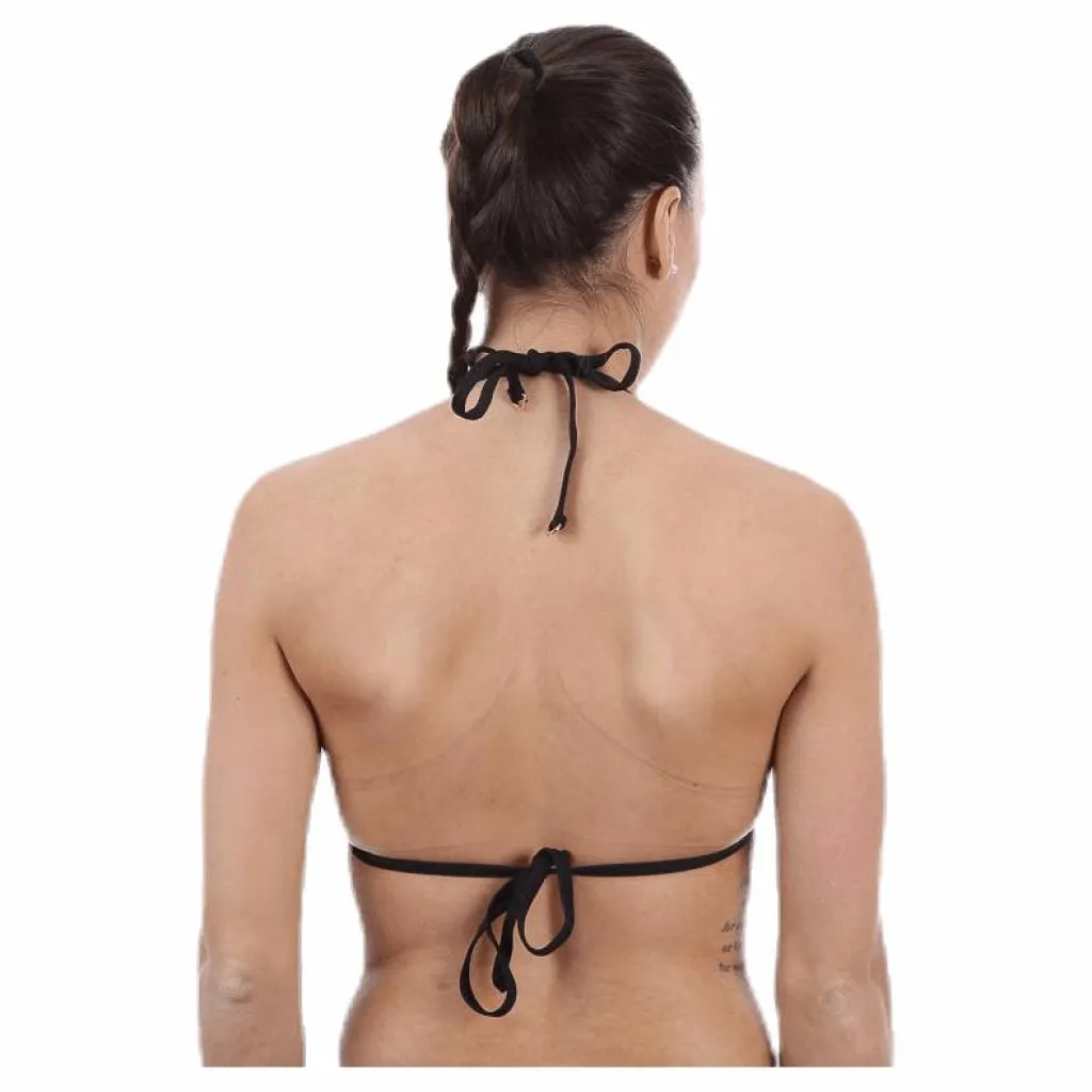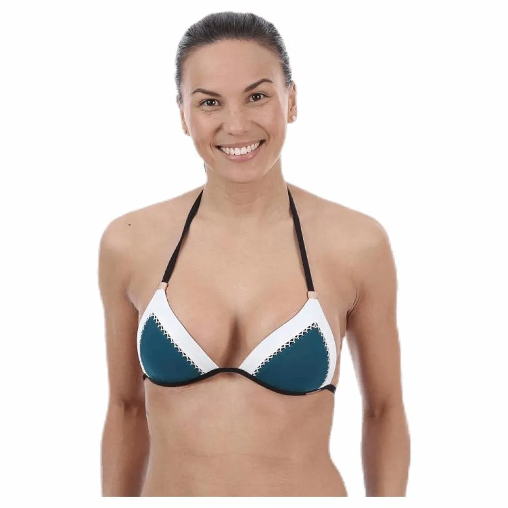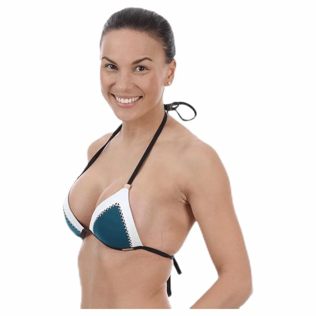 Lätt vadderad trekants överdel med handgjorda virkade dekorationer vid kuporna i en snygg färgkombination.Knytning i rygg och nacke. Gulddetaljer och logoflik under vänstar kupan. Passar A-B kupa.
