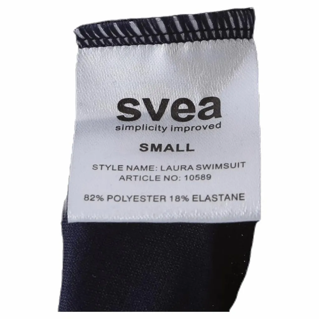 Laura Swimsuit är v-ringad framtill och har en u-formad rygg med svea printstrax under u-ringningen. Axelbandet är av elastiskt resårband och har logga som sträcker sig hela vägen runt om.