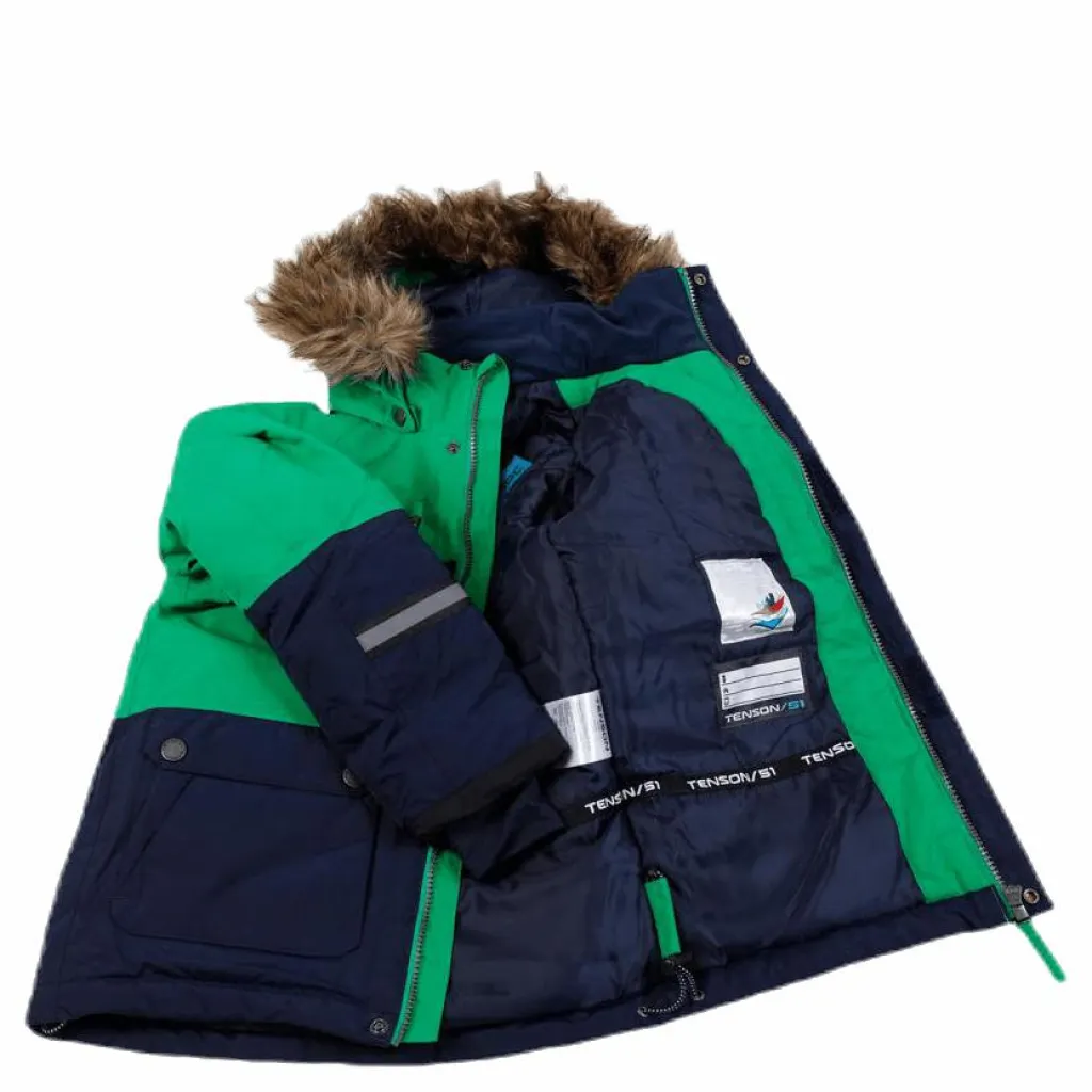 Snygg vinterjacka till de minsta! Vintage design i ny modern tappning med kontrastblockfärger och syntetisk päls runt huvan. Många små fickor för viktiga saker! MPC material som är vind-och vattentätt med maximal andningsförmåga. Passar till byxan Dino.